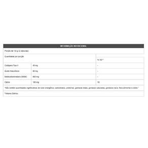 Ingredientes: Metilsulfonilmetano MSM , hialuronato de sódio obtido pela fermentação de Streptococcus zooepidemicus, colágeno de frango com colágeno tipo II não desnaturado, estabilizantes carbonato de cálcio, polivinilpirrolidona, lubrificante estearato de magnésio e antiumectante dióxido de silício.