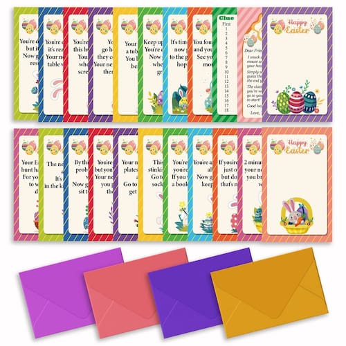 - 20 cartas de jogo de pistas de caça ao tesouro de Páscoa (18 cartas de pista de caça e 2 cartas em branco personalizadas) e 1 carta de carta, 1 lista de cartas de pistas, com 22 envelopes de .
