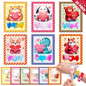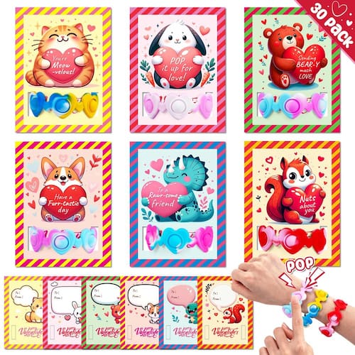 -?Presentes de Dia dos Namorados para crianças?Apresentando nosso conjunto exclusivo de presentes de Dia dos Namorados, com 30 pulseiras pop em forma de coração e 30 cartões de Dia dos Namorados (6 designs). Cada cartão de dia dos namorados tem uma piada especial que combina com o padrão de animais fofos