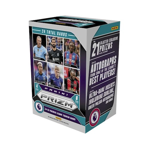 - Caixa Blaster oficial Panini Prizm Premier League 2024–25 – Edição de varejo com estrelas, novatos e prêmios exclusivos com tema EPL