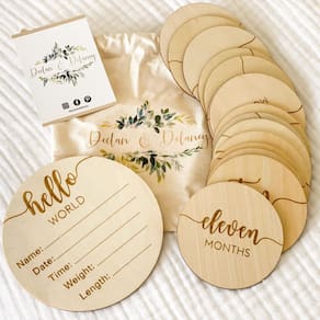 - Reutilizáveis e duráveis. Nossos discos mensais de madeira são um conjunto perfeito para presente de herança, incluindo uma placa de anúncio de nascimento de madeira para fotos de boas-vindas do hospital.