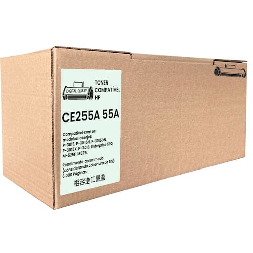Toner Compatível CE255A 55ACompatível com os modelos laserjet: P-3015, P-3015N, P-3015DN, P-3015X, P-3016, Enterprise 500, M-525F, M525.Rendimento aproximado (considerando cobertura de 5%) cores: 6.000 PáginasMarca: Digital QualyDiversos motivos podem causar variação no rendimento, tais como fonte utilizada, desenhos gráficos, gramatura da folha, etc.As Marcas, Modelos e Referencias citadas no anúncio, pertencem aos seus respectivos fabricantes, Ditas como referências para o uso correto do produto.Imagens meramente Ilustrativas, podendo variar caixa e outros aspectos do mesmo.Caixa do Produto pode variar conforme seu lote.Garantia de 03 meses contra defeitos de fabricação. Marca: Digital Qualy