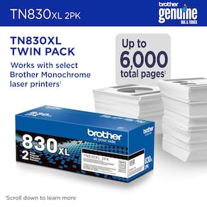 Brother Cartucho de toner genuíno TN830XL 2PK preto para impressora de alto rendimento, pacote com 2 - Imprima até 3.000 páginas cada(1) - Imprima com confiança e imprima mais com os cartuchos de toner pretos genuínos TN830XL 2PK da Brother de alto rendimento, a escolha conveniente para impressão eficiente e de alto volume em impressoras Brother monocromáticas a laser (preto e branco) - Qualidade superior em todas as páginas. Com desempenho confiável e consistente, o toner genuíno Brother produz impressões a laser preto e branco premium em tons nítidos e nítidos que não desbotam ou mancham. - EFICIÊNCIA ATENDE A ECONOMIA DE ACOMPANHAMENTO. Este pacote duplo de alto rendimento oferece rendimento de até 3.000 páginas/cartucho, até 6.000 páginas no total (1). Desfrute de menores custos de impressão por página e a conveniência de menos substituições, em comparação com os cartuchos TN830 padrão. - ampla variedade abrangente de produtos. O toner genuíno Brother oferece várias opções para atender a diferentes requisitos de quantidade de impressão, incluindo seleções de alto rendimento para ajudá-lo a lidar facilmente com necessidades de impressão de alto volume. - Monitore os níveis do tonificador virtualmente em qualquer lugar. Ao usar uma impressora com uma conexão sem fio, o aplicativo Brother Mobile Connect permite que você monitore o uso de toner e solicite cartuchos de substituição da conveniência do seu dispositivo móvel. (2)