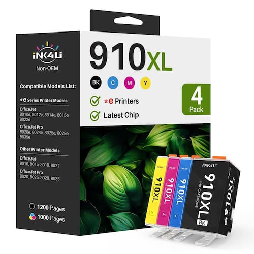 Pacote combo de cartuchos de tinta 910XL remanufaturados cartuchos de tinta 910XL 910 para usar com OfficeJet Pro 8025e 8028e 8015e 8035e 8034e 8020 8025 8010 8030 8035 8028 impressora (1BK/1C/1C/1C/1C) 1M/1Y, 40 P) - 1. Item do produto: cartuchos de tinta remanufaturados INK4U para cartuchos de tinta 910XL, pacote combo para funcionar com impressoras OfficeJet Pro 8010e 8020e 8030e *e série 8010 8020 8030 series - 2. Compatível com modelos de impressora da série *e: Compatível com impressoras OfficeJet 8010e, 8012e, 8014e, 8015e, 8022e e OfficeJet Pro 8020e, 8024e, 8025e, 8028e, 8035e - 3. Compatível com outros modelos de impressora da série: Compatível com impressoras OfficeJet 8010, 8015, 8018, 8022 e OfficeJet Pro 8020, 8025, 8028, 8035 - 4. Conteúdo do produto: 1 × 910XL preto, 1 × 910XL ciano, 1 × 910XL magenta, 1 × 910XL amarelo (4 pacotes de cartuchos de tinta 910XL 910 no total) - 5. Alto rendimento de páginas: Rendimento máximo de páginas de mais de 1.200 páginas por 910 xl 910 preto e mais de 1.000 páginas por 910xl 910 cores (5% de cobertura com base em papel A4) - 6. Qualidade de impressão premium: o cartucho de tinta INK4U 910XL 910 garante que você imprima texto nítido e fotos coloridas para seus registros de trabalho e vida. - 7. Aviso importante: Quando a mensagem "Alterado ou Clonado" aparecer, clique em "OK" para prosseguir.
