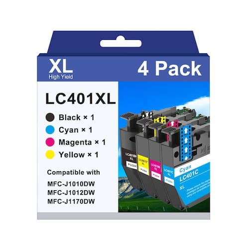 Impressoras compatíveis: Brother MFC-J1010DW, MFC-J1012DW, MFC-J1170DW Rendimento de páginas: até 500 páginas por cartucho de tinta LC401 Preto XL, 500 páginas por LC401XL Cartucho de tinta padrão de cor LC401XL cartuchos de tinta LC401XL obtendo uma leitura brilhante e vivacidade de cores vivas para projetos e impressões diárias. Vantagem dos nossos cartuchos de tinta LC401XL: os chips mais recentes oferecem aos nossos clientes uma qualidade de impressão suave e de alta qualidade. Projetado para ser facilmente instalado e substituído. - Conteúdo da embalagem: 1 x LC401XL preto, 1 x ciano LC401XL, 1 x magenta LC401XL, 1 x amarelo LC401XL, 1 x manual do usuário (não cartuchos Autêntico). - Compatibilidade da impressora: Brother MFC-J1010DW, MFC-J1012DW, MFC-J1170DW. - Alto rendimento de página para cartuchos de tinta Brother LC401XL (aprox. ): 500 páginas por cartucho de tinta (5% de cobertura *tamanho de papel A4) - Qualidade: os cartuchos de tinta LC401XL podem ser identificados instantaneamente por suas impressoras e funcionam perfeitamente, tornando documentos diários, relatórios, cartas, gráficos e fotos muito claros e brilhantes. - O chip de nova geração mostra o nível de tinta preciso, o pacote combo LC401XL traz a você uma impressão vívida e clara. - Dica: verifique a lista de modelos de impressora compatíveis para os cartuchos de tinta LC401XL antes de fazer seu pedido e certifique-se de que o modelo da impressora esteja incluído. - O cartucho de tinta não é criado ou vendido pela Brother.