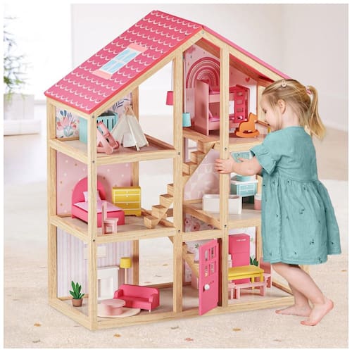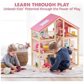 Deixe a imaginação fluir com estilo moderno e móveis incríveis Esta casa de bonecas de três andares possui 6 quartos, incluindo sala de estar, sala de jantar, quarto, banheiro, quarto infantil e quarto de bebê, cada um com seus próprios móveis modernos correspondentes. São 30 peças de mobiliário incluídas, permitindo que as crianças organizem e desenhem livremente os quartos como desejarem. A casa de bonecas é feita de madeira de alta qualidade e ecológica, e é construída para durar.