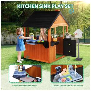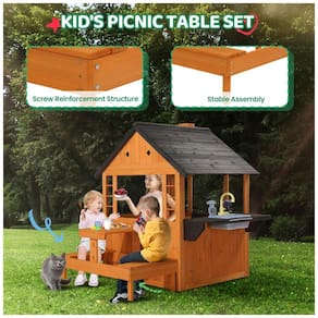 A Casa de Madeira Infantil JOYMOR é perfeita para estimular a imaginação das crianças! Inclui uma casa de madeira, uma pia de brinquedo, uma mesa de piquenique com cadeiras e uma caixa de correio. As crianças de 3 a 8 anos vão adorar criar cenários de brincadeiras ao ar livre. A pia de brinquedo possui um reservatório embutido na parte inferior, e a torneira pode ser acionada manualmente para dispensar água. O interior espaçoso da casa permite que várias crianças brinquem juntas, atendendo às suas necessidades sociais e lúdicas. Os cantos e bordas arredondados garantem a segurança dos pequenos. Feita com madeira de alta qualidade e durável, resistente ao vento, à chuva e à luz solar, esta casa vai acompanhar as crianças por muito tempo, proporcionando uma infância feliz e cheia de diversão.