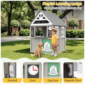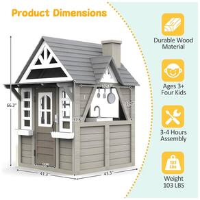 Com um interior espaçoso medindo 110 x 105 x 169 cm, esta casa de brincar generosamente dimensionada pode acomodar confortavelmente várias crianças de uma só vez. O amplo espaço permite brincadeiras em grupo, promovendo habilidades sociais e cooperativas entre amigos. Possui uma adorável área de cozinha completa com campainha, vaso de flores, fogão, pia e relógio, elementos interativos que incentivam o faz de conta e aumentam a diversão, oferecendo horas infinitas de entretenimento. Minuciosamente projetada para simular uma casa real, esta casa de brincar inclui detalhes como janelas, porta da frente e até uma campainha, proporcionando às crianças uma experiência realista que estimula a imaginação e a criatividade. Fabricada com madeira de alta qualidade, esta casa de brincar infantil ao ar livre oferece uma textura bonita e resistente ao longo de anos de brincadeiras cheias de aventuras. Os materiais naturais garantem um ambiente seguro para suas crianças. Projetada para durabilidade, esta casa de brincar é robusta e estável, proporcionando um espaço seguro para as crianças explorarem e brincarem. Os pais podem confiar em sua capacidade de resistir às brincadeiras enérgicas de várias crianças.