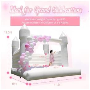 Com dimensões de 4,10m de comprimento, 3,50m de largura e 3,05m de altura, esta grande casa de pula-pula oferece uma ampla área de salto tanto para crianças quanto para adultos, com capacidade máxima de 6 jogadores e peso total de até 204kg. Durabilidade é nossa prioridade ao projetar nossos brinquedos. Esta casa de pula-pula comercial é feita de material PVC durável de 0,45mm, certificado pela CE e ASTM, proporcionando forte capacidade de suporte de peso. Utilizamos técnicas de costura de dupla a quádrupla camada, com 45 pontos por polegada, garantindo qualidade excepcional. O potente soprador, com certificação UL e ETL, infla totalmente o brinquedo em 1 minuto, com 2 grandes aberturas de ventilação com zíperes em ambos os lados para desinflar facilmente. 7 ganchos em arcos na parte superior facilitam a instalação de balões e flores. O pacote inclui 100 balões decorativos. Para garantir a entrega em perfeitas condições, reforçamos a embalagem em camadas duplas e realizamos teste de pressão por 24 horas antes do envio. Consulte o manual de instruções para montagem, armazenamento, manutenção e cuidados.