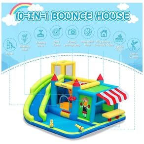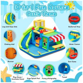 A Casa de Pulos Inflável FBSPORT é o sonho de consumo das crianças, com 10 opções de brincadeiras incríveis reunidas em um só lugar: escorregador, piscina de splash, área de pulos, dois canhões d'água, parede de escalada, duas cestas de basquete, sprinklers, túnel, área para fotos divertidas, jogos de arremesso e um mercadinho com guarda-sol para brincadeiras de faz de conta. Feita com materiais premium e design seguro, possui costuras reforçadas, rede de proteção e corrimãos adequados, garantindo anos de diversão segura para as crianças. Pode ser utilizada tanto molhada quanto seca, sendo ideal para os dias quentes de verão ou para os dias chuvosos e frios. Acompanha um potente motor de 620W para inflar rapidamente, e todos os acessórios necessários para garantir a diversão, como bolas infláveis, pistolas d'água e estacas para fixação.