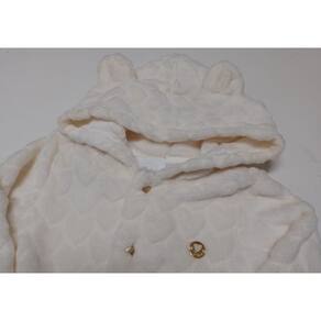 Características do Produto: - Jaqueta / Casaco super macia, quente e confortável. Todo em pelo trabalhado em forma de corações, que vai manter sua pequena super protegida do frio e no maior estilo. Detalhe de plaquinha personalizada da marca aplicada na frente. Possui punhos e barra ribanados. Capuz com orelhinhas em alto relevo, que dão um charme todo especial a peça. Abertura frontal por botões de pressão personalizados da marca. Simplesmente um encanto.