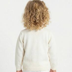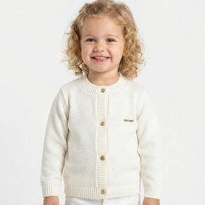Casaco Liso Tricô Kids feito em tecido acrílico, gola redonda, detalhe em metal Tricô Kids no peito lateral, fechamento em botões, manga longa e etiquetas personalizadas.