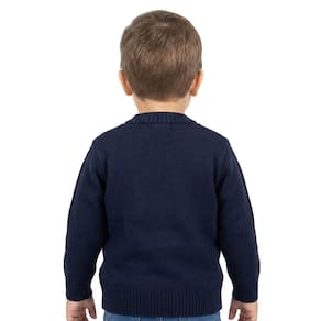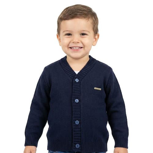 Casaco Liso Tricô Kids feito em tecido acrílico, gola redonda, estampa Tricô Kids na lateral do peito, fechamento em botões, manga longa e etiquetas personalizadas.