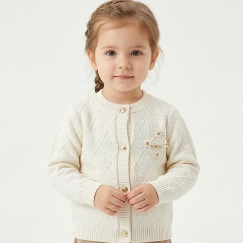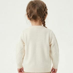Casaco Losango Trabalhado Tricô Kids feito em tecido algodão e acrílico, gola redonda, Tricô Kids em dourado no peito, fechamento em botões, manga longa e etiquetas personalizadas.