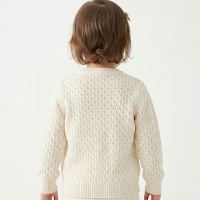 Casaco Texturizado Tricô Kids feito em tecido algodão e acrílico, gola redonda, Tricô Kids em dourado no peito, fechamento em botões, manga longa e etiquetas personalizadas.