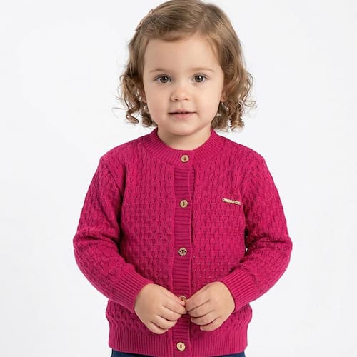 Casaco Texturizado Tricô Kids feito em tecido algodão e acrílico, gola redonda, Tricô Kids em dourado no peito, fechamento em botões, manga longa e etiquetas personalizadas.