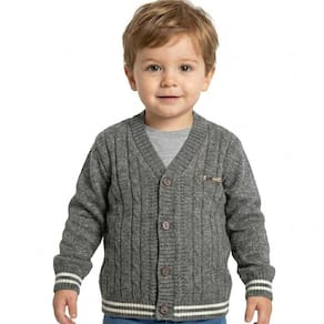 Casaco Trança e Canelado Tricô Kids Menino feito em tecido algodão e acrílico, gola em V, Tricô Kids em metal no peito, fechamento em botões, manga longa e etiquetas personalizadas.