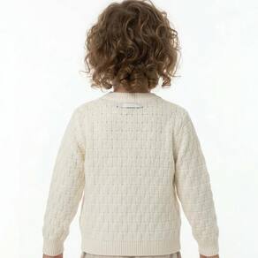 Casaco Transpassado Tricô Kids feito em tecido algodão e acrílico, gola redonda, Tricô Kids em dourado no peito, fechamento em botões, manga longa e etiquetas personalizadas.