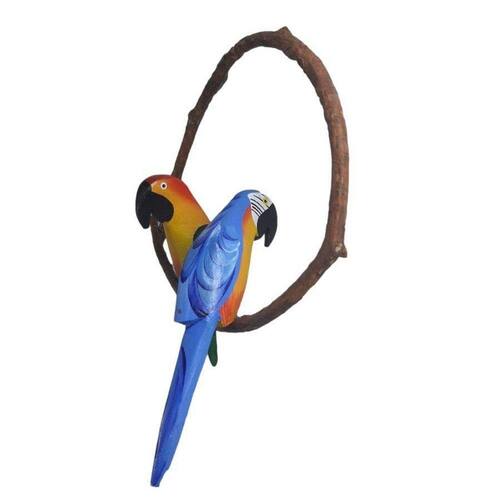 Casal de arara Uma linda representação da fauna brasileira com um casal de araras. Todo feito a mão, desde o processo de corte da madeira até o acabamento da peça. As araras vão em um cipó (ou liana) do serrado totalmente natural, trazendo assim um aspecto de natureza para o pássaro. Medidas do produto. Tamanho total 28 cm (da ponta da cauda até o topo do cipó). Tamanho total do pássaro 20 cm (da ponta da cauda até o bico). Diâmetro cipó 27 cm. Por se tratar de um produto artesanal e com um cipó natural, as medidas podem variar um pouco, nada que afete a qualidade do produto