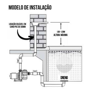 Funciona com Bomba Exclusiva ou pode funcionar com a mesma bomba do filtro. Vazão aproximada da cascata é de 2,5 m/h. Tubulação para 1 entrada de 50mm.