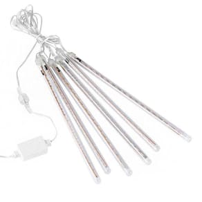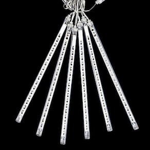 São 8 tubos com 30 LEDs na cor Branco Frio que simulam uma Chuva de Neve. Eles podem ser fixados em árvores, janelas, portas, paredes, ou em qualquer ambiente coberto.
