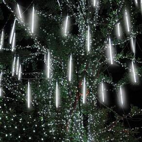 São 8 tubos com LED na cor Branco Frio que simulam uma Chuva de Neve. Eles podem ser fixados em árvores, janelas, portas, paredes, ou em qualquer ambiente coberto.