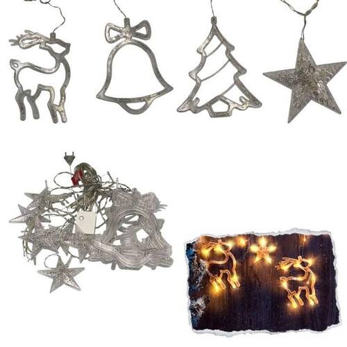 Especificações: - Material: LED, Cobre, Polipropileno e Componentes Eletrônicos - Comprimento: 2,5 metros - Medida Árvore: 19cm x 15cm - Medida Sino: 18cm x 14,5cm - Medida Rena: 19,5cm x 12,5cm - Medida Estrela: 08cm x 8,5cm - Funções: 08 - Cor: Branco Quente - Voltagem: 127v / 7,2w / 0,06A - Peso Total: 330 gramas