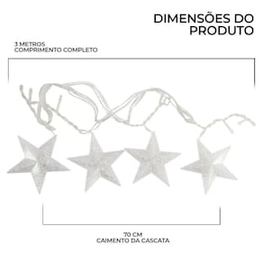 Dimensões: -Comprimento: 3 Metros -Estrela: 9cm-Comprimento máximo do caimento da cascata: 70cm-Espaço entre cada estrela: 20cm Peso: Aprox. 300g Cor do LED: Branco Quente