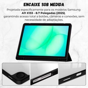 Case acrílico suporte caneta para samsung a11 8.7 polegadas Cor: preto Proteção moderna e funcional para o seu tablet no dia a dia. Estrutura resistente e design transparente. Fabricada em acrílico rígido com acabamento reforçado, a capa protege contra riscos, impactos leves e sujeira, mantendo o tablet firme e bem encaixado. O visual transparente valoriza o aparelho, deixando-o elegante e discreto. Mais praticidade no uso diário. Conta com suporte integrado para caneta, ideal para quem utiliza stylus no trabalho, estudos ou lazer, evitando perdas e facilitando o transporte. A escolha ideal para quem busca proteção, praticidade e visual moderno em um único acessório. ------------------ ------------------ Essa capa é compatível com qual modelo R: compatível com tablet samsung a11 modelos x133 - 8.7 polegadas 2025 . O suporte de caneta já vem incluso na capa R: sim. A capa possui suporte integrado para caneta. A caneta está inclusa R: não. O anúncio refere-se somente à capa. A capa protege contra quedas R: oferece proteção contra riscos, impactos leves e uso diário, ajudando a preservar o tablet. O material é flexível ou rígido R: o material é acrílico rígido, resistente e durável. Atrasa o uso de botões ou entradas R: não. A capa possui recortes precisos para botões, câmeras e conexões. ------------------ Especificações ------------------ Compatibilidade: samsung a11 x33 2025 Tamanho: 8.7 polegadas Material: acrílico rígido Design: transparente ------------------ Conteúdo ------------------ 1x capa acrílico com suporte de caneta Anúncio referente a capa Acessórios que ambientam as fotos não inclusos. ------------------ Apresentação: ------------------ - qualidade garantida. - atendimento qualificado. - enviamos para todo o brasil. - compra garantida. - despachamos em até 1 dia útil após confirmação do pagamento Garantimos a devolução por arrependimento em até 7 dias, após o recebimento e de 15 dias contra defeitos de fabricação. Marca: Não Informado Ean: 7893321520103