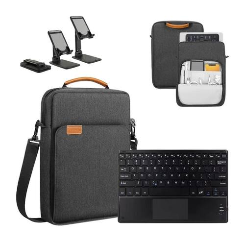 Case bag + suporte + teclado sem fio para samsung s7 fe 12.4 Cor: preto O kit 3 em 1 reúne os acessórios ideais para transformar seu tablet ou em uma verdadeira estação de trabalho portátil. Composto por uma case bag transversal, um teclado com touchpad e um suporte universal ajustável, o conjunto é perfeito para quem busca conforto, produtividade e mobilidade no dia a dia. Compatível com tablets e ipads de até 13 polegadas, o kit é ideal para home office, estudos, viagens ou trabalho em movimento. A bolsa possui design moderno e material resistente à água, oferecendo segurança ao transportar seus dispositivos. O teclado bluetooth proporciona digitação fluida e touchpad integrado, enquanto o suporte dobrável garante o ângulo perfeito e uma postura ergonômica durante o uso. Perfeito para quem quer unir estilo, funcionalidade e desempenho em um único kit compacto ------------------ ------------------ O teclado é compatível com qualquer tablet R: sim, o teclado é compatível com tablets e ipads de até 13 polegadas que possuam conexão bluetooth. O teclado tem touchpad integrado R: sim, o teclado possui um touchpad sensível e preciso, permitindo controle total sem precisar de mouse. O suporte é ajustável R: sim, o suporte universal é dobrável e permite ajustar o ângulo de visualização conforme sua necessidade. A bolsa é impermeável R: a case bag possui material resistente à água, ideal para proteger seus equipamentos durante o transporte. A bolsa é impermeável R: a case bag possui material resistente à água, ideal para proteger seus equipamentos durante o transporte. O teclado precisa de pilhas R: não. Ele é recarregável por cabo usb incluso. ------------------ Especificações ------------------ Tipo de conexão: bluetooth Teclado: recarregável via usb Tamanho do teclado: 24cm x 15cm. Tamanho da case bag: 35.5cm x 28cm Compatibilidade: tablets e ipads de até 13 polegadas ------------------ Conteúdo ------------------ 1x case bag transversal 13 1x teclado com touchpad 1x suporte universal ajustável Anúncio referente a kit para tablets e Acessórios e aparelhos que ambientam as fotos não inclusos. ------------------ Apresentação: ------------------ - qualidade garantida. - atendimento qualificado. - enviamos para todo o brasil. - compra garantida. - despachamos em até 1 dia útil após confirmação do pagamento Garantimos a devolução por arrependimento em até 7 dias, após o recebimento e de 15 dias contra defeitos de fabricação. Marca: Não Informado Ean: 7793596866558