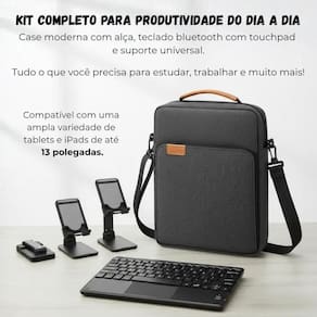 Case bag + teclado touchpad+ suporte para lenovo p12 tb371fc Cor: cinza O kit 3 em 1 reúne os acessórios ideais para transformar seu tablet ou em uma verdadeira estação de trabalho portátil. Composto por uma case bag transversal, um teclado com touchpad e um suporte universal ajustável, o conjunto é perfeito para quem busca conforto, produtividade e mobilidade no dia a dia. Compatível com tablets e ipads de até 13 polegadas, o kit é ideal para home office, estudos, viagens ou trabalho em movimento. A bolsa possui design moderno e material resistente à água, oferecendo segurança ao transportar seus dispositivos. O teclado bluetooth proporciona digitação fluida e touchpad integrado, enquanto o suporte dobrável garante o ângulo perfeito e uma postura ergonômica durante o uso. Perfeito para quem quer unir estilo, funcionalidade e desempenho em um único kit compacto ------------------ ------------------ O teclado é compatível com qualquer tablet R: sim, o teclado é compatível com tablets e ipads de até 13 polegadas que possuam conexão bluetooth. O teclado tem touchpad integrado R: sim, o teclado possui um touchpad sensível e preciso, permitindo controle total sem precisar de mouse. O suporte é ajustável R: sim, o suporte universal é dobrável e permite ajustar o ângulo de visualização conforme sua necessidade. A bolsa é impermeável R: a case bag possui material resistente à água, ideal para proteger seus equipamentos durante o transporte. A bolsa é impermeável R: a case bag possui material resistente à água, ideal para proteger seus equipamentos durante o transporte. O teclado precisa de pilhas R: não. Ele é recarregável por cabo usb incluso. ------------------ Especificações ------------------ Tipo de conexão: bluetooth Teclado: recarregável via usb Tamanho do teclado: 24cm x 15cm. Tamanho da case bag: 35.5cm x 28cm Compatibilidade: tablets e ipads de até 13 polegadas ------------------ Conteúdo ------------------ 1x case bag transversal 13 1x teclado com touchpad 1x suporte universal ajustável Anúncio referente a kit para tablets e Acessórios e aparelhos que ambientam as fotos não inclusos. ------------------ Apresentação: ------------------ - qualidade garantida. - atendimento qualificado. - enviamos para todo o brasil. - compra garantida. - despachamos em até 1 dia útil após confirmação do pagamento Garantimos a devolução por arrependimento em até 7 dias, após o recebimento e de 15 dias contra defeitos de fabricação. Marca: Não Informado