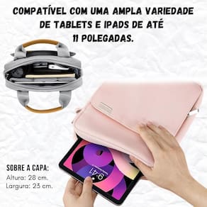 Case com alça protetora, compartimento principal espaçoso, bolso frontal com zíper, bolso de malha, bolso reforçado para tablet, alça regulável, resistente à água, zíper robusto.Características