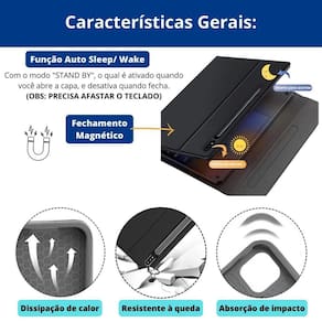 - recursos como fechamento magnético: Para maior segurança, dissipação de calor para evitar superaquecimento e absorção de impacto para proteger seu tablet de danos, você pode se sentir confortável e confiante em qualquer situação. Além disso, a função autosleep economiza energia, desligando automaticamente o teclado quando não estiver em uso.