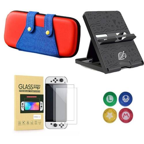 Case Nintendo Switch Oled + Suporte + 4 Grips + 2 Películas Kit contendo: - 1 case para Nintendo Switch Oled Vermelho e Azul Mario - 2 películas de vidro premium para Nintendo Switch Oled - 2 kits de instalação de película pano seco, pano úmido e adesivo removedor de poeira - 4 grips para analógicos conforme imagem - 1 suporte para Nintendo Switch Oled