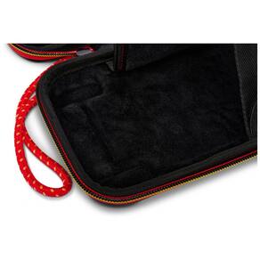 O interior é moldado para acomodar o console em modo portátil, com revestimento em feltro que evita riscos na carcaça e na tela. O case conta com um suporte integrado para modo mesa (tabletop), permitindo apoiar o console para jogar com controles separados, além de uma aba acolchoada que funciona como protetor de tela e traz compartimentos para armazenar até nove cartuchos de jogo.