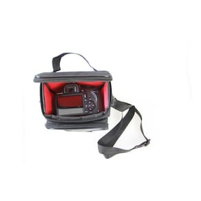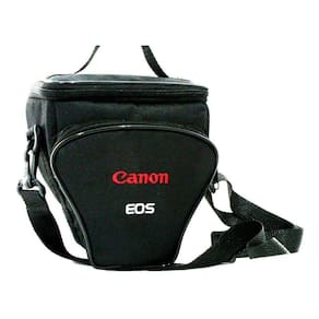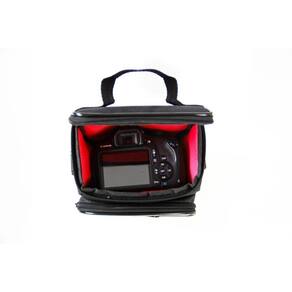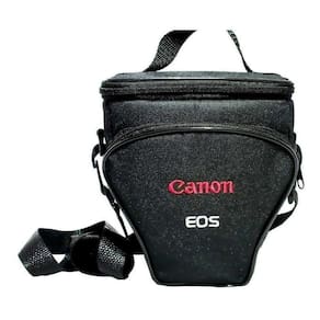 Possui bolso frontal para transporte de bateria, pilhas e carregadores. Alça de mão fixa e alça tira colo regulável Bordado canon eos