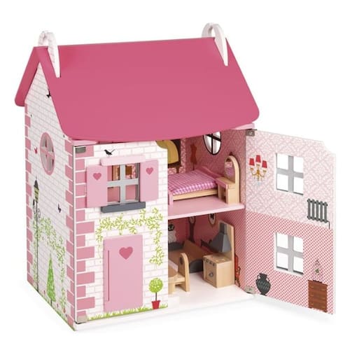 Uma fantástica casa de bonecas de 3 andares lindamente decorada com móveis variados. Abra as portas da casa para brincar e feche-as para guardar tudo dentro e transportar com mais facilidade. As crianças podem criar seu próprio mundo e inventar suas próprias histórias! As práticas portas são magnéticas e a casa também pode ser aberta pelo teto para melhor acesso aos diferentes cômodos.