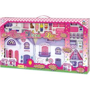 Casinha que abre e ao tocar a campainha emite som. Acompanha móveis para montar diferentes ambientes: Sala, quarto, cozinha, banheiro, playground e uma linda família.