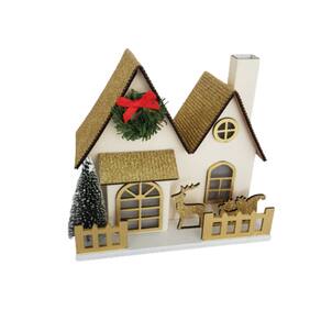 MINI CASINHA DECORATIVA DE NATAL CONFECCIONADA EM MADEIRA, PAPEL ONDULADO, PLÁSTICO E ILUMINAÇÃO COM LEDs.