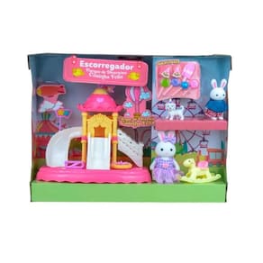 O conjunto inclui miniaturas de acessórios que compõem o cenário, como o escorregador e personagens adoráveis.