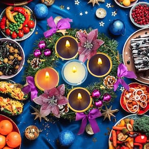 - Coroa de Advento realista: este castiçal redondo roxo é feito à mão com galhos e cones de pinheiro verdes artificiais, enfeites de bola roxa, frutas vermelhas e laços dourados; os galhos de pinheiro são fixados e enrolados na base prateada, que é realista o suficiente e não é fácil de cair