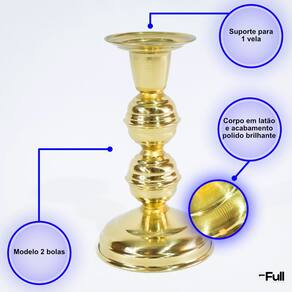 Castiçal Dourado de Latão Suporte 1 Vela Igreja 2 Bolas 12cm