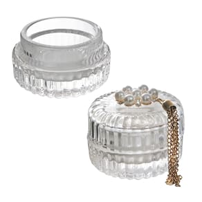 Elegante e delicado, este castiçal é confeccionado em vidro transparente com acabamento trabalhado, criando um visual sofisticado e atemporal. A peça acompanha uma tampa que segue o mesmo design, proporcionando charme extra e ajudando a proteger o interior quando não estiver em uso.