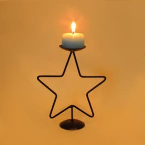 Castiçal Estrela Acompanha 1 vela azul modelo festa Produtos da marca Velitas. Somos uma fábrica, de velas e ferros decorativos, desde de 1984 no mercado. Castiçal: Peça em ferro com pintura eletrostática, que garante uma maior resistência e durabilidade em comparação com peças esmaltadas ou com pintura spray. O produto possui um espeto para melhor fixação da vela. Pintura marrom escura, quase preta, com minúsculos pontos pretos e dourados. A pintura dá um efeito especial a peça. Peça produzida de forma artesanal. Medidas do castiçal: Largura: 14 cm Altura: 16 cm Profundidade: 08 cm Vela: Vela de parafina pura Petrobras. A vela pura garante uma maior durabilidade, não produz fumaça preta que possa sujar a parede ou criar um aspecto desagradável, e também possui um cheiro suave e natural da parafina. Duração da vela: Aproximadamente 8 horas, o tempo pode variar de acordo com a temperatura ambiente. Medidas da vela: altura: 3 cm largura: 5 cm Imagens meramente ilustrativas, o produto pode apresentar pequenas variações por se tratar de um produto artesanal. Aviso de segurança: Acenda as velas longe de produtos inflamáveis, de corrente de ar e em recipiente protetor. Não deixe velas acesas desacompanhadas. Marca: Velitas (r)