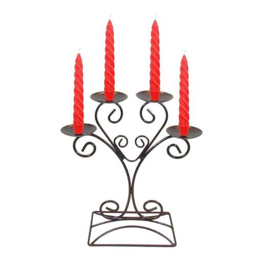 Castiçal Jantar Romântico Vela vermelha Dia Dos Namorados 1 castiçal centro de mesa 4 velas 4 velas torcida 17 cm vermelha Produtos da marca Velitas.Somos uma fábrica, de velas e ferros decorativos, desde de 1984 no mercado. Centro de mesa:Peça em ferro com pintura eletrostática, que garante uma maior resistência e durabilidade em comparação com peças esmaltadas ou com pintura spray. Peça produzida de forma artesanal. Medidas do Centro de mesa:Largura: 20 cm altura: 32 cm profundidade: 14 cm Velas:Velas de parafina pura com adição de corante. A vela pura garante uma maior durabilidade, não produz fumaça preta que possa sujar a parede ou criar um aspecto desagradável, e também possui um cheiro suave e natural da parafina. Duração da vela:Aproximadamente 5 horas, o tempo pode variar de acordo com a temperatura ambiente. Medidas da vela:Diâmetro máximo da base: 2,2 cm altura: 17 cm Imagens meramente ilustrativas, o produto pode apresentar pequenas variações por se tratar de um produto artesanal. aviso de segurança: Acenda as velas longe de produtos inflamáveis, de corrente de ar e em recipiente protetor. Não deixe velas acesas desacompanhadas. Marca: Velitas (r)