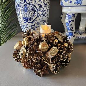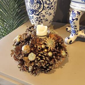 Traga o brilho e o aconchego do Natal para sua decoração com este candelabro de pinhas dourado. Cada detalhe foi cuidadosamente elaborado para criar um efeito sofisticado e festivo, perfeito para mesas, aparadores ou composições natalinas. Composto por pinhas naturais e elementos dourados com toque de glitter, ele é ideal para receber uma vela no centro e iluminar seus momentos com charme e elegância.