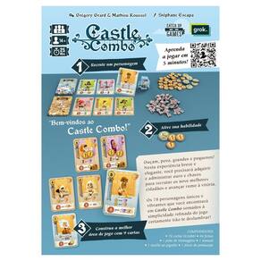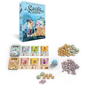 No Castle Combo, os participantes montam uma grade de 3×3 cartas, adquirindo personagens do Castelo ou da Aldeia conforme o movimento do Mensageiro. Cada carta possui um custo em Ouro, oferece habilidades, descontos e condições de pontuação, exigindo planejamento para criar combinações eficientes ao longo de nove rodadas. A ambientação apresenta um reino formado por nobres, artesãos, soldados, religiosos e camponeses, retratados em um clima medieval leve e colorido. As ilustrações transmitem uma atmosfera descontraída que destaca alianças e rivalidades entre os personagens.
