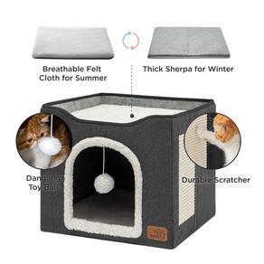 Bedsure Grande caverna para gatos de estimação com bola fofa para pendurar e arranhar - Privado e aconchegante: a área inferior fechada oferece um espaço oculto para gatos, cães pequenos e coelhos dormirem, enquanto a plataforma superior pode ser usada como uma almofada de soneca para todos os fins para olhar pela janela, relaxar e relaxar. Ótimo para casas com vários gatos. - Conforto espaçoso: o compartimento inferior do esconderijo de gatos mede 42 x 42 x 33 cm, garantindo um covil espaçoso e aconchegante para gatos de todas as idades. A plataforma superior é maior do que a maioria das marcas, oferecendo muito espaço para o seu gato se esticar e ficar aconchegante. - Design seguro para animais de estimação: refúgio para gatos feito de materiais MDF que aceitam animais de estimação com certificação CARB e tecido macio de lã de cordeiro. Esta grande casa para gatos está equipada com uma tábua de sisal durável e uma bola de pelúcia para pendurar para manter seu gato envolvido e feliz. - Resistente e elegante: construído com placas de MDF resistentes e leves para maior durabilidade. O estilo clássico funciona em qualquer lugar da casa, da sala de estar ao seu quarto, escritório, garagem ou onde quer que seu animal de estimação precise de uma caverna aconchegante para gatos. Os arredores das casas e condomínios para gatos e a almofada superior é feita de placas de MDF leves e resistentes. Gatos com menos de 9 kg podem pular e brincar livremente. - Fácil de cuidar e montar: este cubo de gato para gatos internos pode ser rapidamente montado ou dobrado para facilitar o armazenamento e viagens. Portátil e leve. As almofadas removíveis apresentam capas reversíveis e laváveis na máquina que proporcionam conforto para todas as estações.