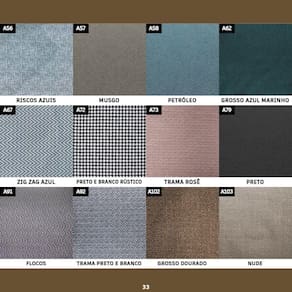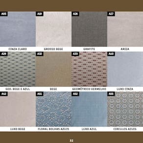 ***Demonstrativo de estampas e cores, compras efetivadas neste anúncio serão automaticamente canceladas.*** Catálogo de Tecidos para Poltronas, Puffs e Sofás-Retrô - D'Rossi Aqui você pode visualizar nossos tecidos em linha, escolha o revestimento ideal para sua Poltrona, puff ou sofá-retrô! Como comprar meu produto com um tecido do catálogo personalizado? 1- Escolha o modelo de poltrona, puff ou sofá-retrô de você deseja comprar; 2- Procure no catálogo o revestimento que você mais gostou, salve o nome dele; 3- Faça a compra diretamente no anúncio do modelo de poltrona, puff ou sofá-retrô que você gostou, independente do revestimento anunciado. 4- Especifique nas mensagens da compra o nome do revestimento que você deseja em seu produto. - Atenção: Os tecidos deste catálogo estão sujeitos à alteração do preço final no produto. - Atenção: As cores dos tecidos pode sofrer variações, devido ao lote e/ou a resolução do monitor e/ou iluminação do ambiente. - Qualquer dúvida nos mande uma pergunta. D'Rossi interiores