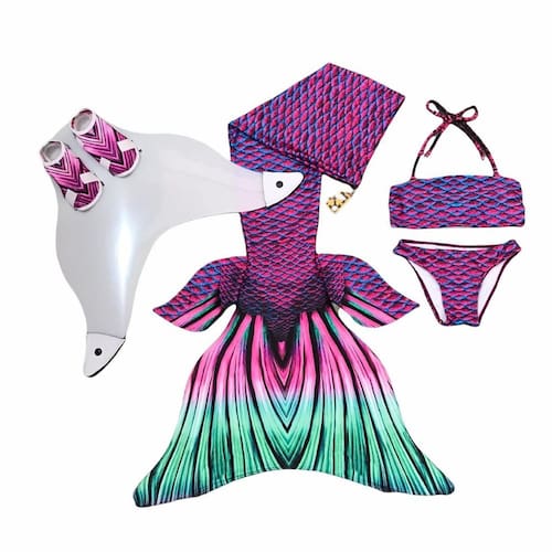• As caudas são indicadas para crianças acima de 7 anos que já nadam muito bem, acompanhadas de um adulto. • Informações de segurança constam no manual que acompanha a cauda. • O kit contém uma cauda de lycra, biquíni completo e nadadeira básica exclusiva e patenteada Sirenita® com sapatilha regulável. • Composição da Cauda de Sereia: 90% Poliéster 10% Elastano / Composição do forro: 100% poliamida